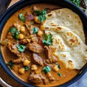 Whether you’re a curry lover or just dipping your toes into the world of spiced stews, this recipe offers the perfect balance of creamy, spicy, and savory notes. And when paired with soft, warm garlic naan brushed with melted butter and fresh herbs? Pure joy on a plate.