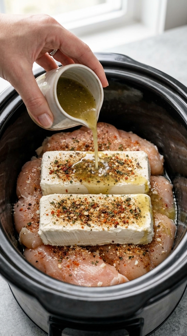 The base of this dish starts with boneless, skinless chicken breasts. They cook gently in the slow cooker, becoming soft enough to shred easily. Cream cheese adds richness and body, creating a smooth, velvety texture.