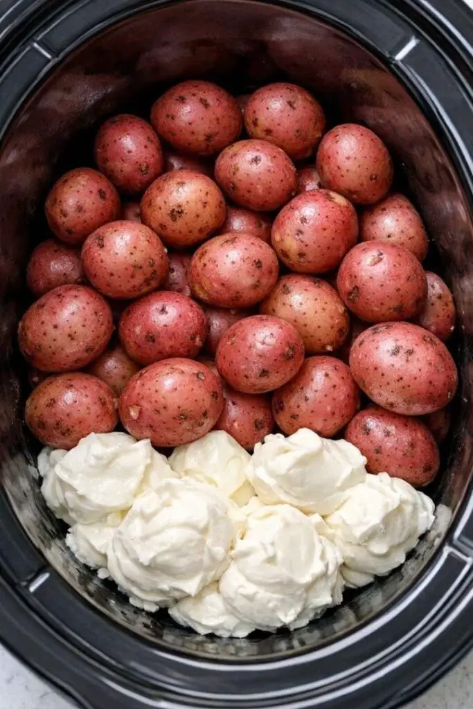 Cover the slow cooker and set it to low heat. Let the potatoes cook for about 5 to 6 hours. Alternatively, you can cook on high for 3 to 4 hours if needed.
