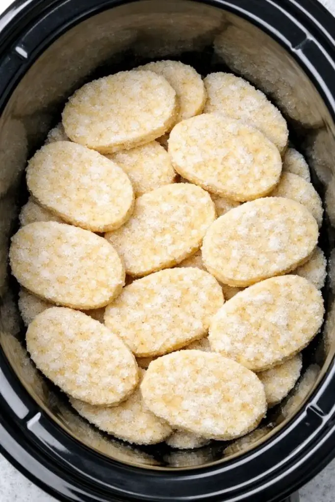 Start by lightly greasing your slow cooker. Then, place the frozen potato patties in a snug layer at the bottom.