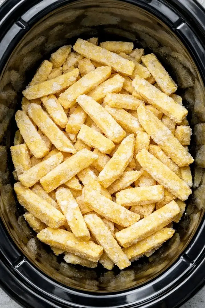 - Add frozen fries to slow cooker.