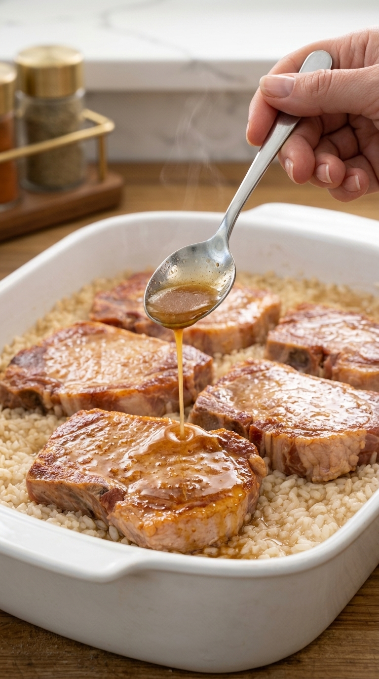 As the casserole cooks, the rice absorbs the broth and soup mixture, creating a creamy, flavorful base. At the same time, the pork becomes tender and juicy, making every bite satisfying. This hands-off approach makes the recipe ideal for busy evenings.