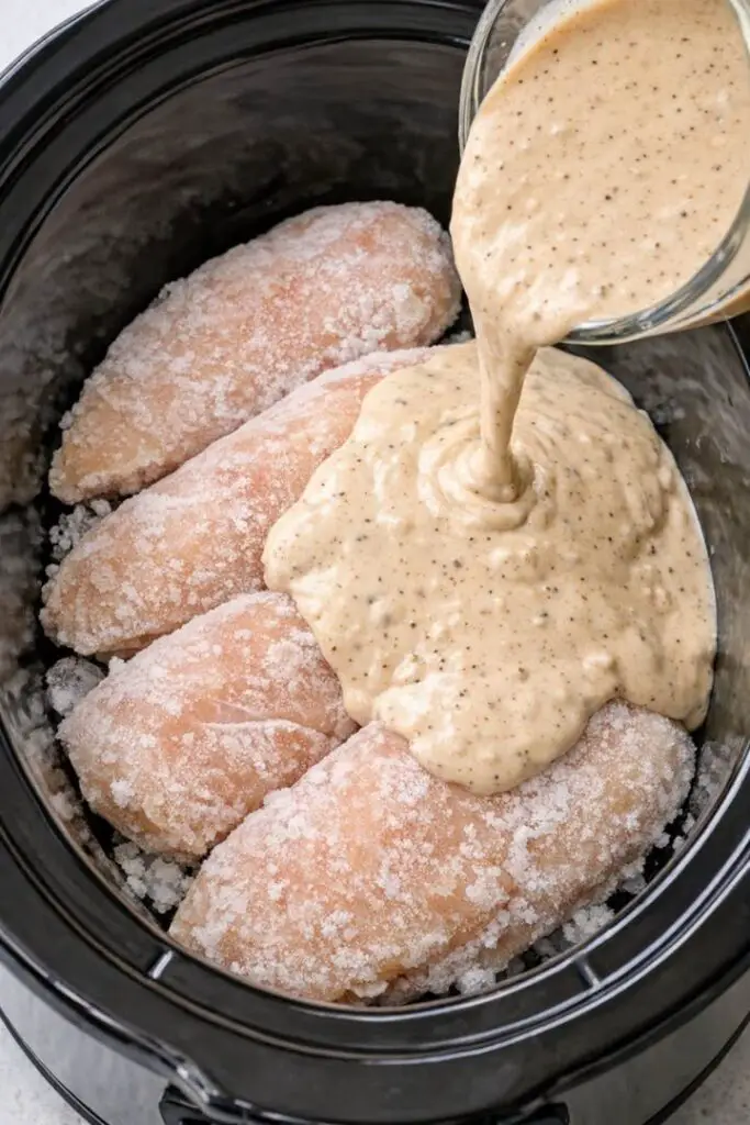 Once everything is in the slow cooker, the transformation begins. Over several hours, the chicken softens and absorbs the creamy sauce.