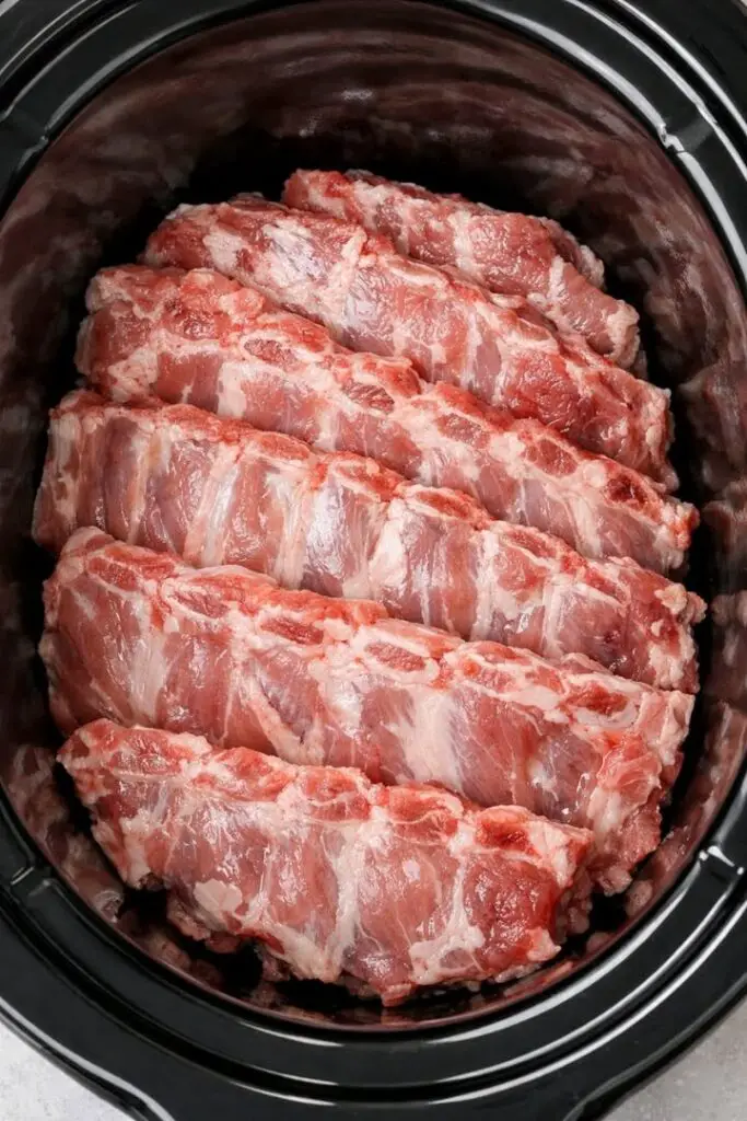 Place the rib sections in the slow cooker in a snug, even layer. Pour the prepared sauce over the ribs, making sure they are fully coated.