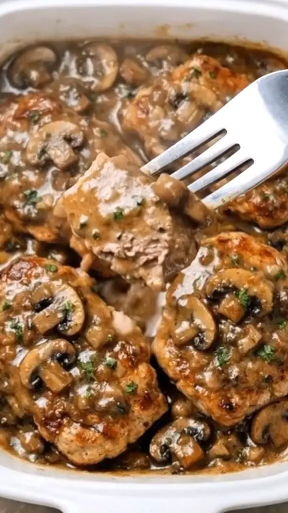 I remember the first time I made this dish on a rainy evening when I wanted something warm and filling without spending hours in the kitchen. I had pork chops in the fridge and a few leftover mushrooms and bacon. As everything cooked together, the aroma filled the house, creating a sense of comfort that only home-cooked meals bring. When I finally sat down to eat, the combination of flavors felt far more special than the effort it took to prepare. Since then, it has become a reliable favorite whenever I need a satisfying, no-fuss dinner.