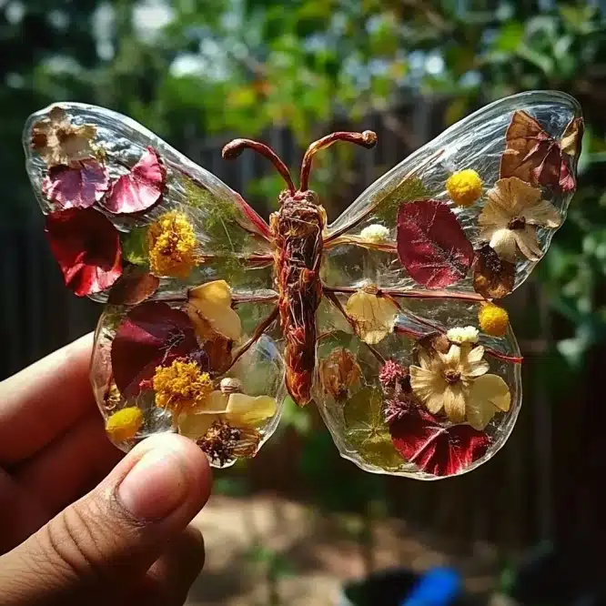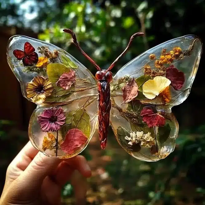 Imagine tiny windows filled with wildflowers, delicate leaves, and golden light. The bioplastic dries semi-clear with a slight amber hue, giving everything inside a soft, dreamy glow. When sunlight hits them just right? Absolutely magical. 🌞
