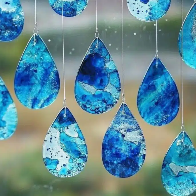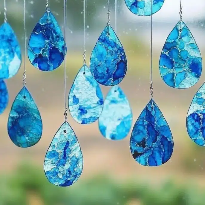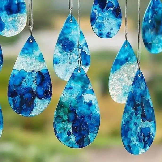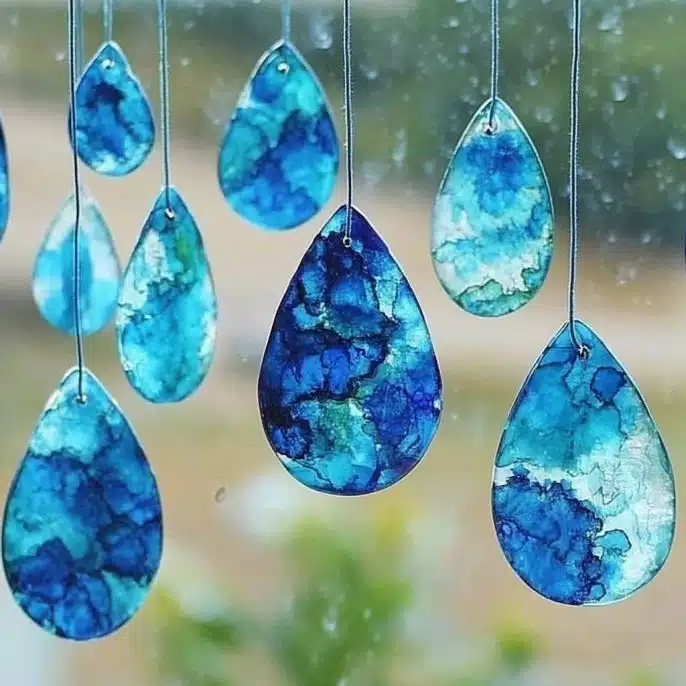 - Use a hole punch at the top of each raindrop and thread through embroidery floss, string, or fishing line. Knot the ends.