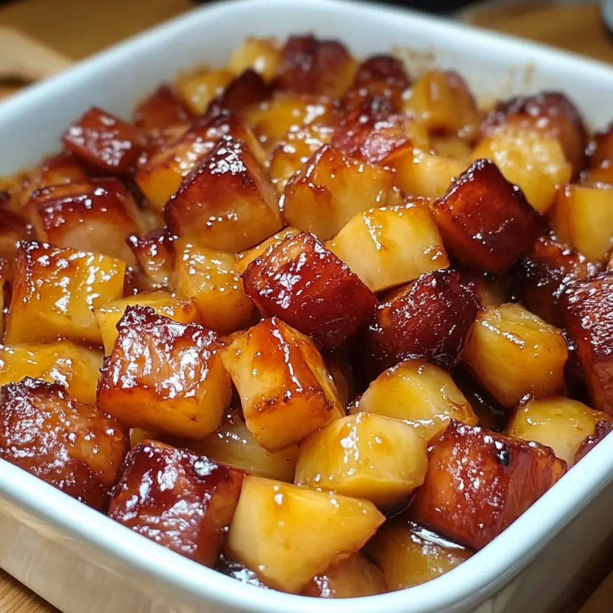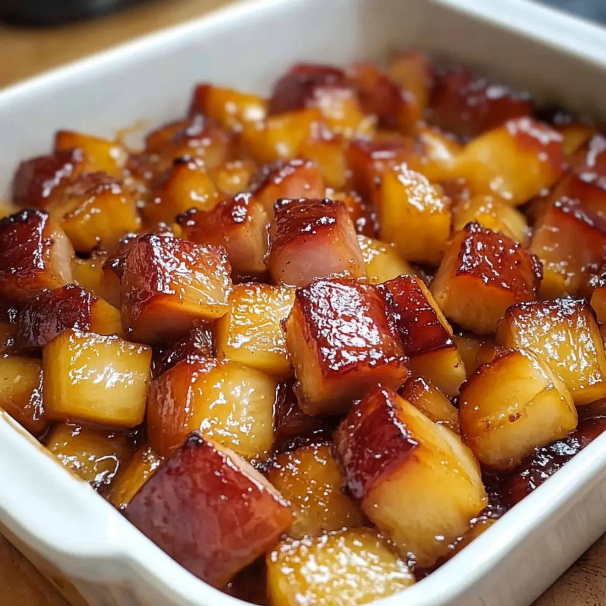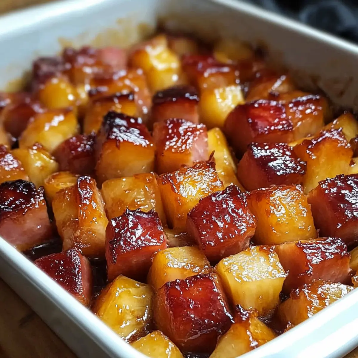 - Add the diced ham and drained pineapple chunks to the baking dish, pour the glaze over the top and stir gently.