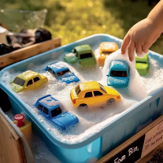 We’re whipping up a Car Wash Foam Bin—a light, fluffy, colorful sensory station that transforms an ordinary afternoon into an engaging, hands-on adventure for your little mechanics. And the best part? It’s made with items you probably already have at home. Let’s get sudsy!