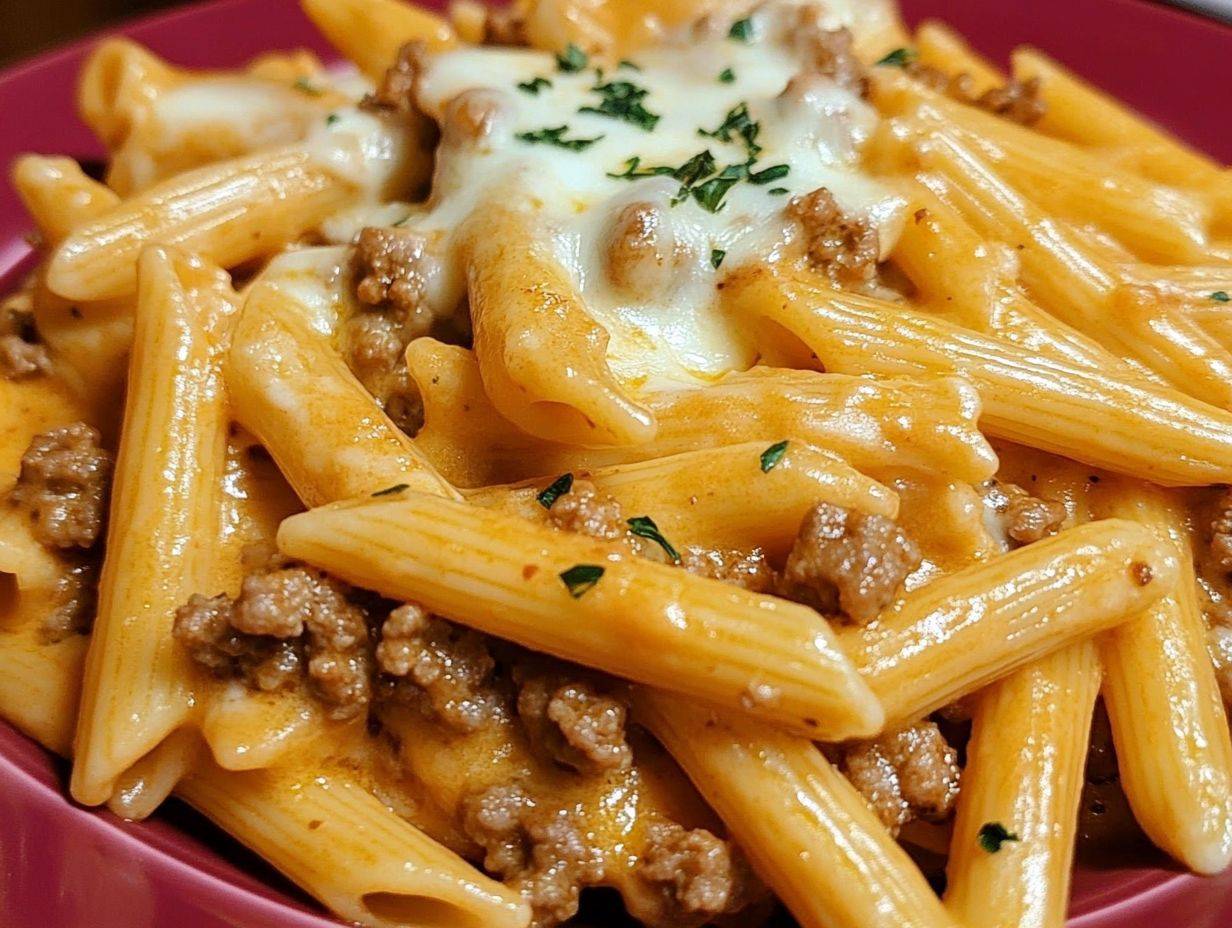 - Add the cooked penne to the skillet and toss it in the creamy sauce. Stir in the mozzarella and Parmesan, letting them melt into a smooth, cheesy sauce.