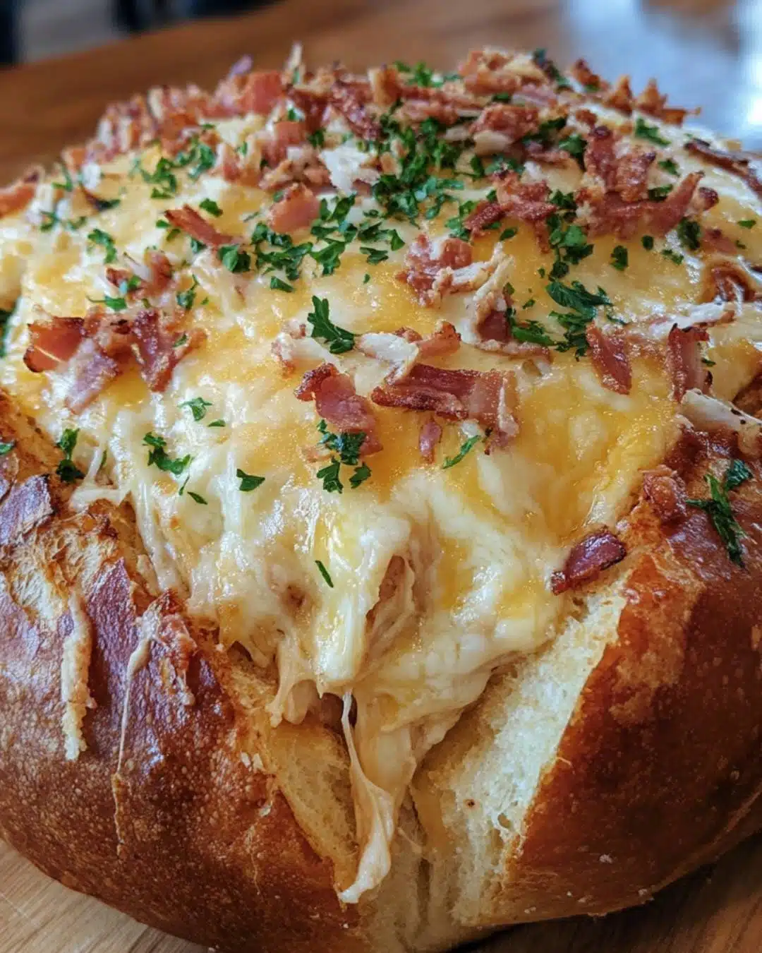 4. Bake the Bread Bowl: Place the filled bread bowl on a baking sheet and pop it in the oven. Bake for 25-30 minutes until the dip is hot and bubbly, and the bread is slightly toasted.
