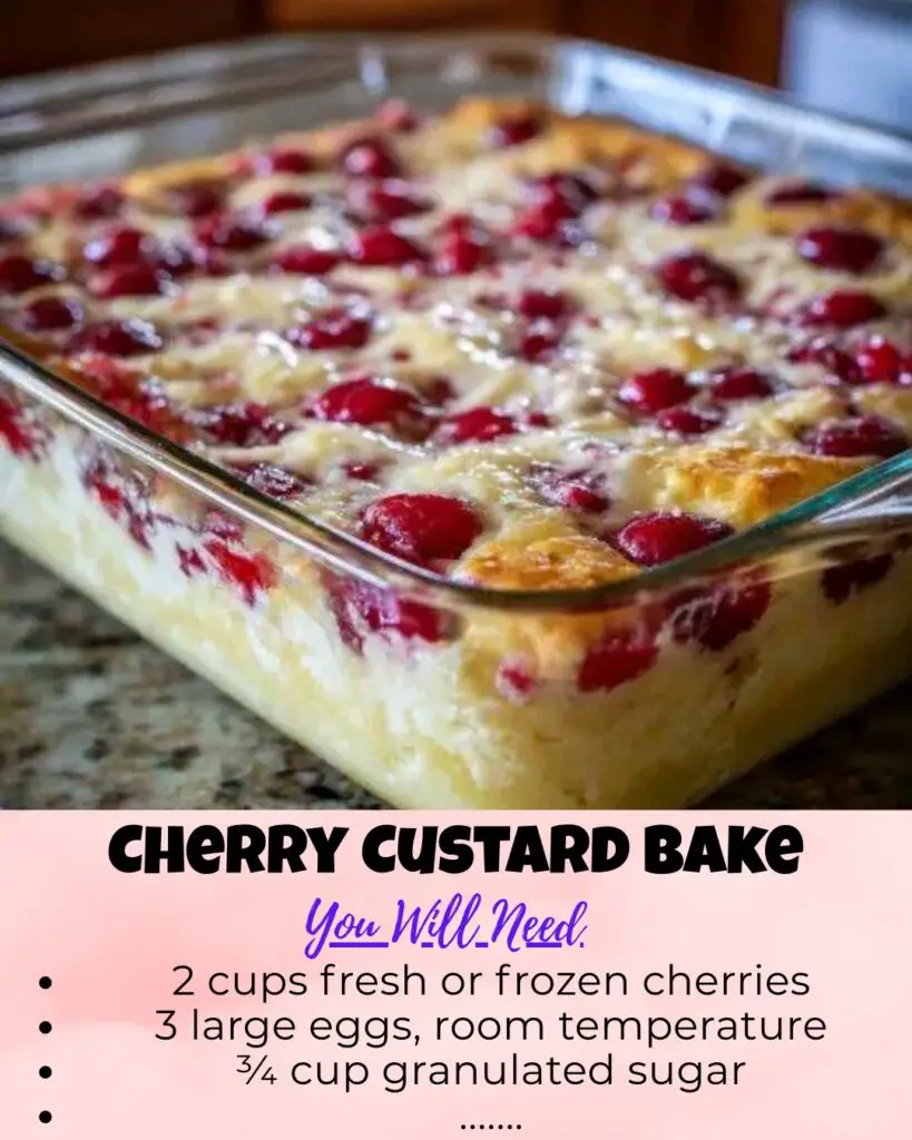 Whether you use fresh summer cherries or frozen fruit from your freezer, this dessert delivers sweet-tart flavor in every bite. Serve it warm, dust it with powdered sugar, and watch it disappear quickly. Once you try Cherry Custard Bake, you will return to it again and again.