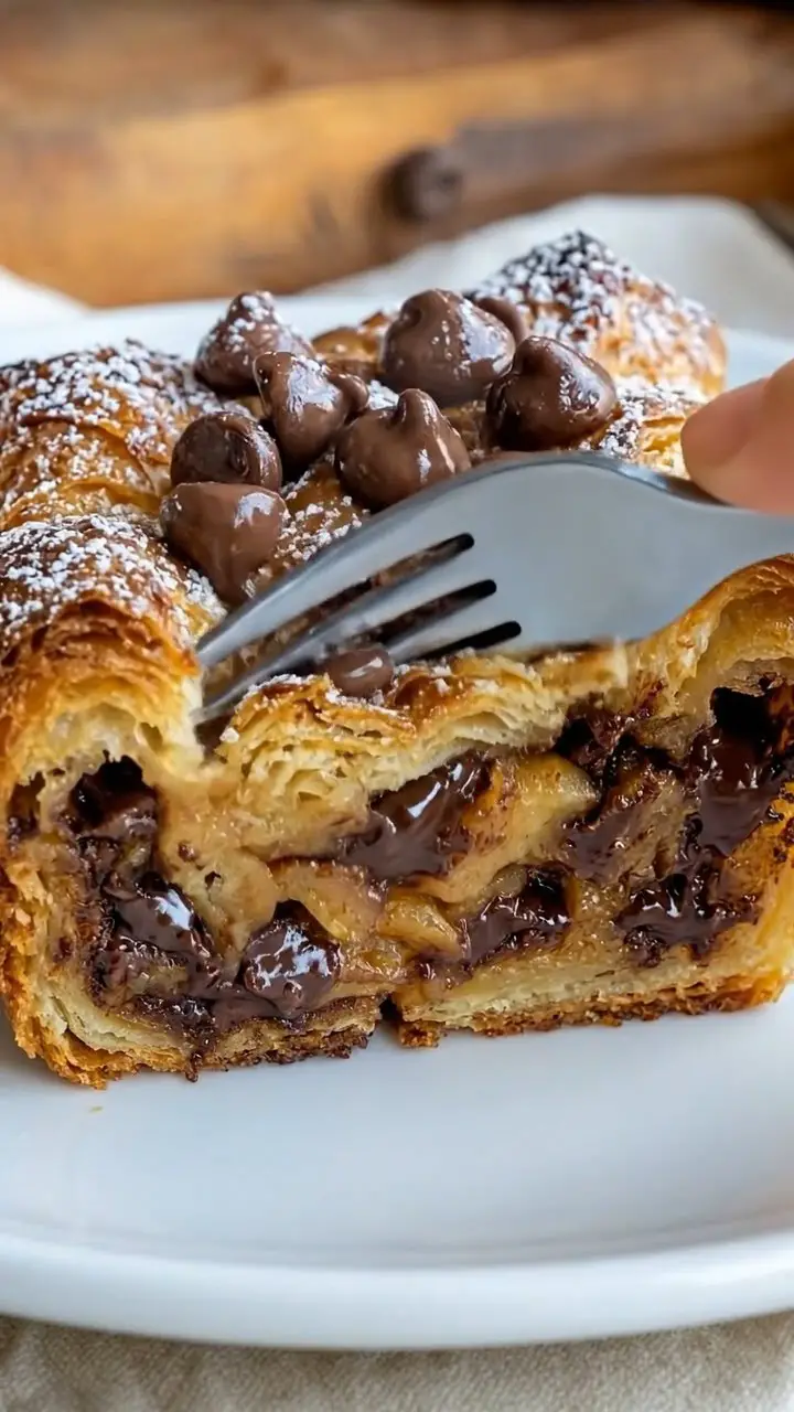 Additionally, the chocolate chips melt into little pockets throughout the dish. As a result, every spoonful gives you flaky pastry, creamy custard, and gooey chocolate in one bite. That balance makes it ideal for both breakfast and dessert.