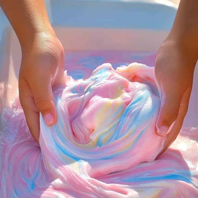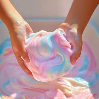 Imagine a soft, stretchy dough that you can mold like clay, pull like taffy, and squish like slime—but without the sticky mess. It’s silky-smooth, lightweight, and slightly foamy, thanks to the dish soap. It’s perfect for shaping, stretching, and even “bubble kneading”!