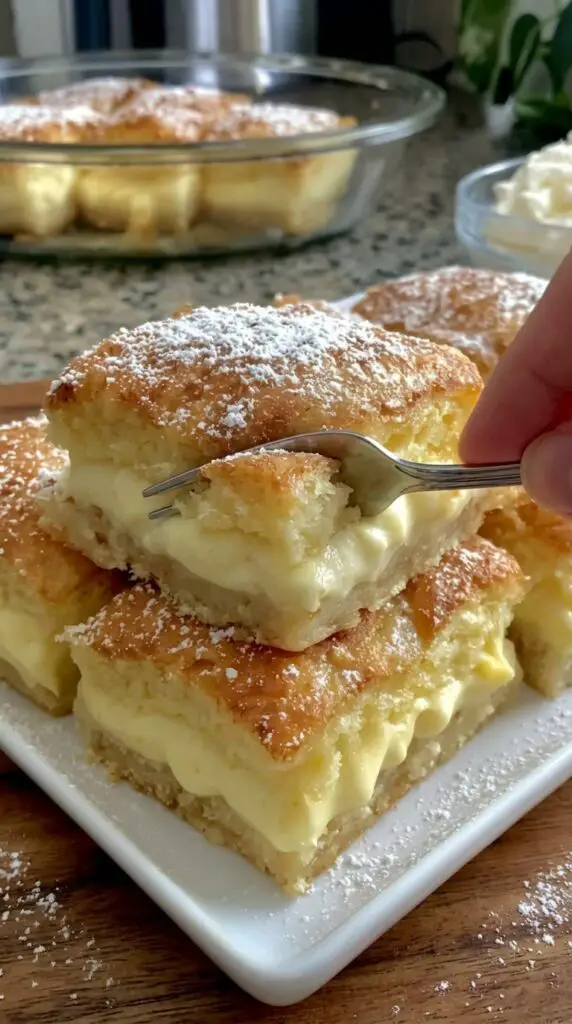 I remember making these squares one rainy afternoon when I wanted something simple but comforting. The kitchen filled with the warm scent of vanilla as the custard thickened on the stove. After patiently waiting for it to chill, I cut into the first square and was surprised by how perfectly the layers held together. Sharing it with family over coffee turned an ordinary day into something special. Since then, it has become a go-to dessert whenever I want something easy yet impressive.