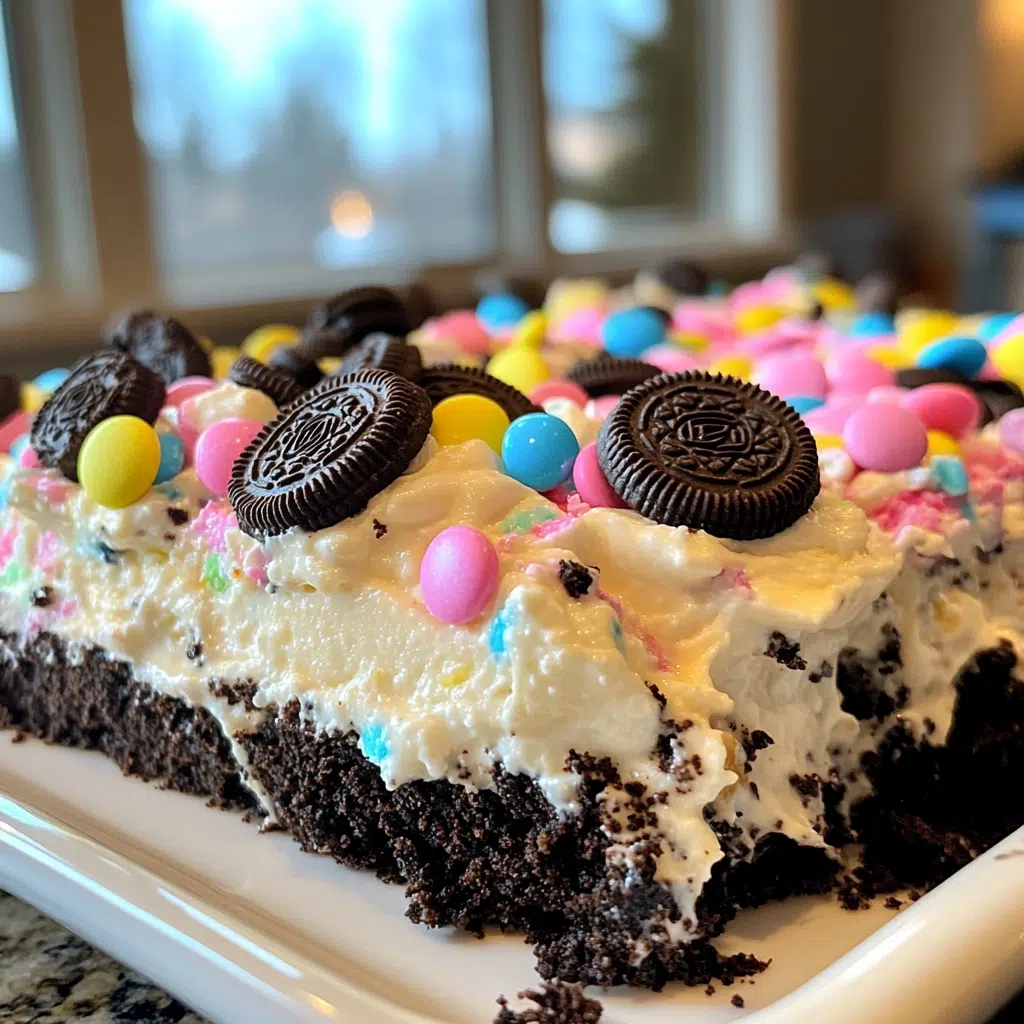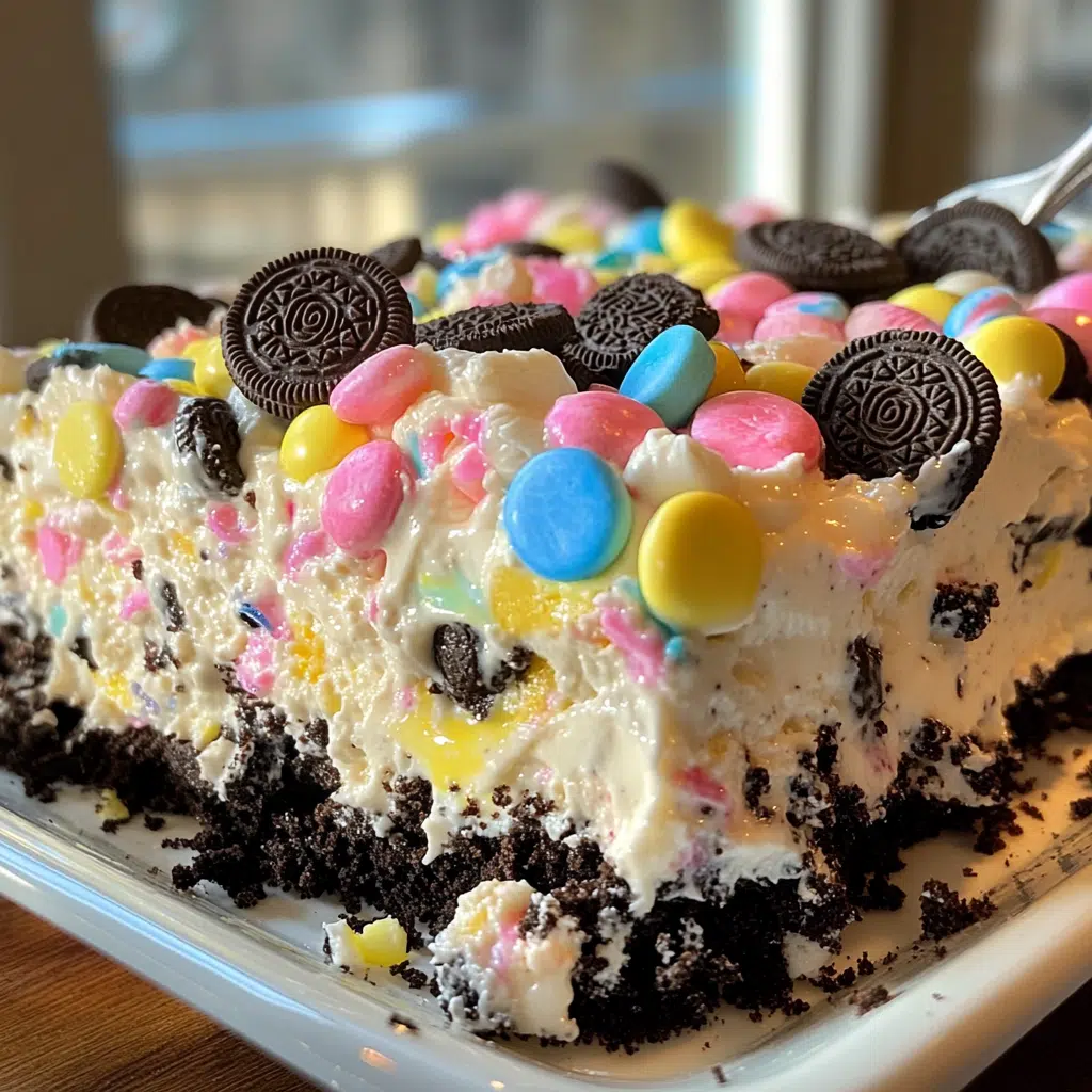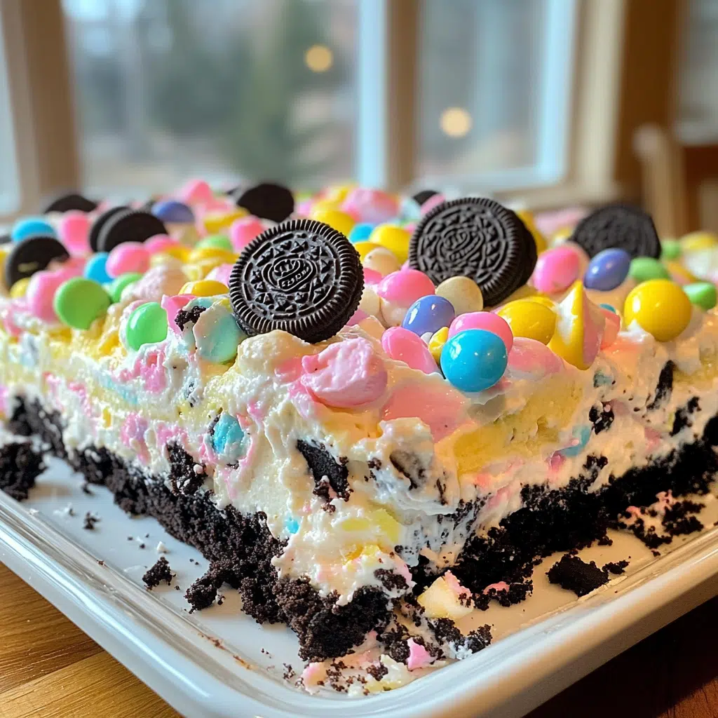 - Sprinkle mini Oreos and pastel M&M's over the top.