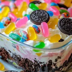 The Easter Dirt Cake Casserole is the ultimate no-bake dessert that combines simplicity, fun, and flavor in one delicious dish. Whether you’re celebrating Easter or any springtime occasion, this dessert will be a hit with everyone. The creamy layers, crunchy Oreo cookies, and colorful candy toppings make it both a treat for the taste buds and the eyes. Give it a try, and it might just become a family favorite for years to come.