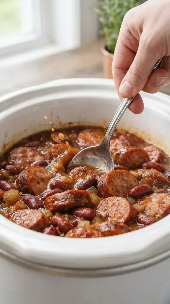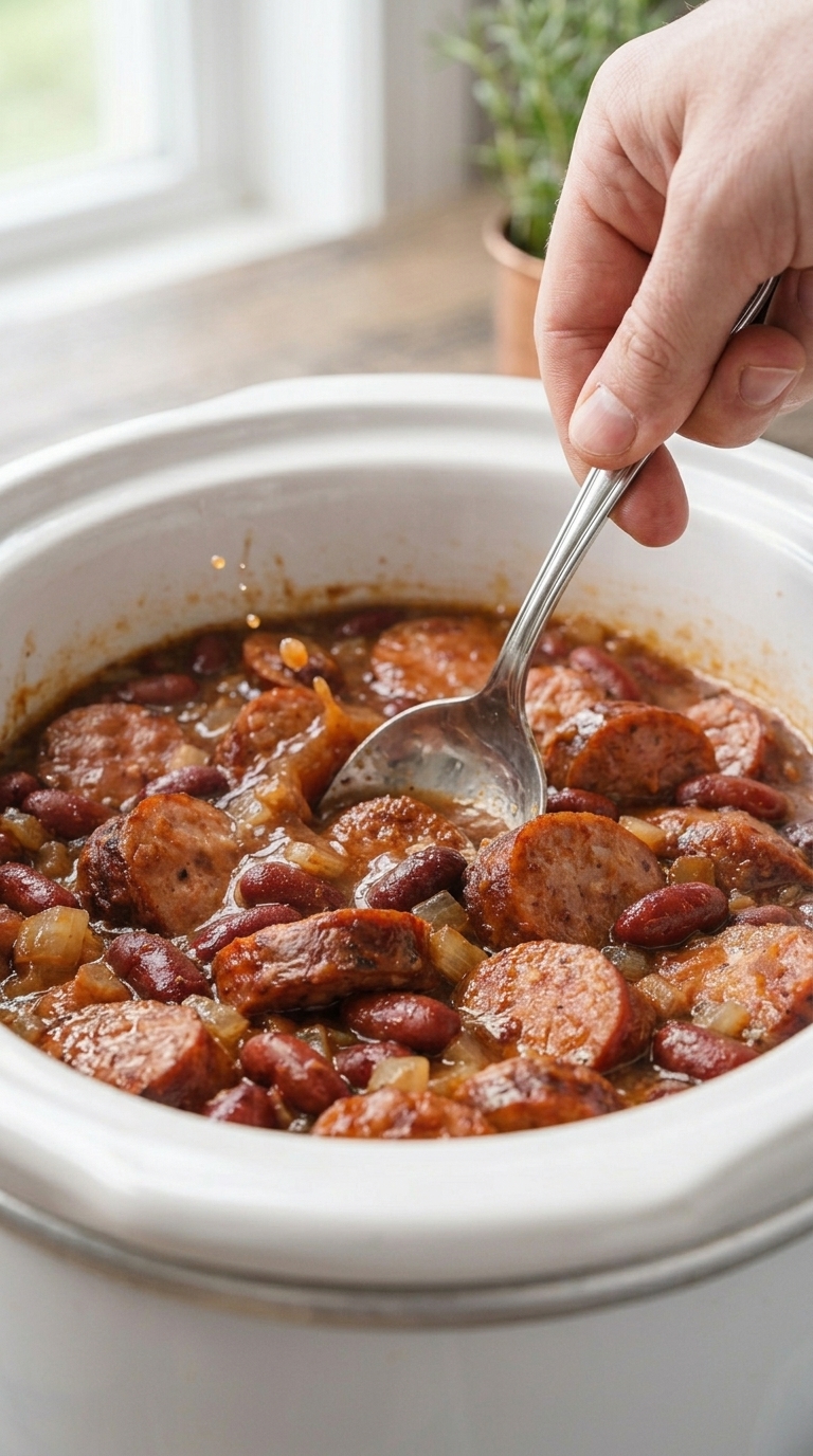 Once finished, taste and adjust seasoning if needed. Serve the sausage and beans hot, straight from the slow cooker, for the best experience.