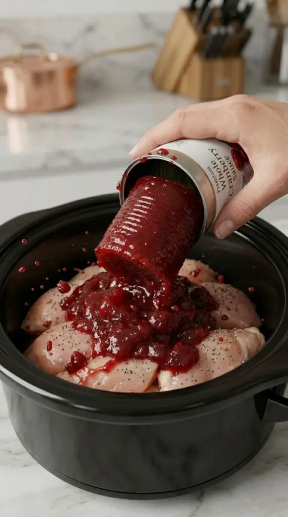 Next, mix the cranberry sauce with the remaining ingredients until smooth. Pour this mixture over the chicken, making sure each piece is well coated. This step ensures even flavor throughout the dish.