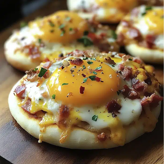 This easy, mouthwatering breakfast uses halves of English muffins as the crust, topped with favorite breakfast staples—eggs, cheese, and optional meats or veggies. Ready in just minutes, it’s customizable and super satisfying!