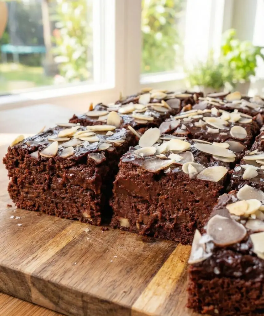 That finishing touch lifts the flavor and balances the sweetness. Then slice the brownies into squares or rectangles and serve. The inside should feel rich and soft, while the almond flakes on top add a bit of contrast.