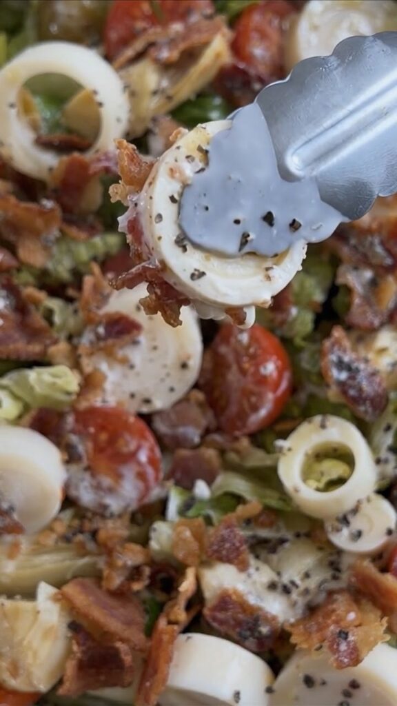 This salad shines because it balances rich ingredients with crisp freshness. The bacon adds smoky depth, while the blue cheese stuffed olives bring bold savory flavor. Meanwhile, the hearts of palm and artichokes keep the texture tender and satisfying.