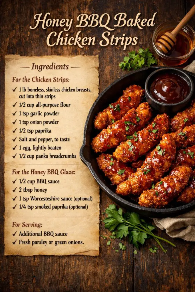 Honey BBQ Baked Chicken Strips bring together everything people love about comfort food. The crispy coating, juicy chicken, and sweet smoky glaze create a dish that feels both indulgent and satisfying.