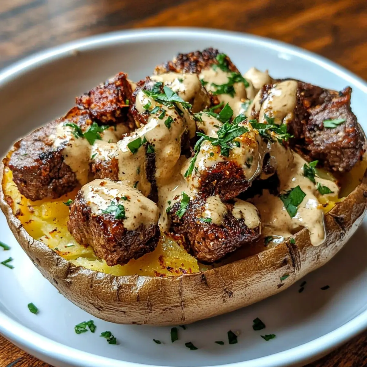 - Stuff each potato with the sautéed steak bites, and generously drizzle the creamy parmesan sauce over the top. Serve immediately to enjoy at its freshest.