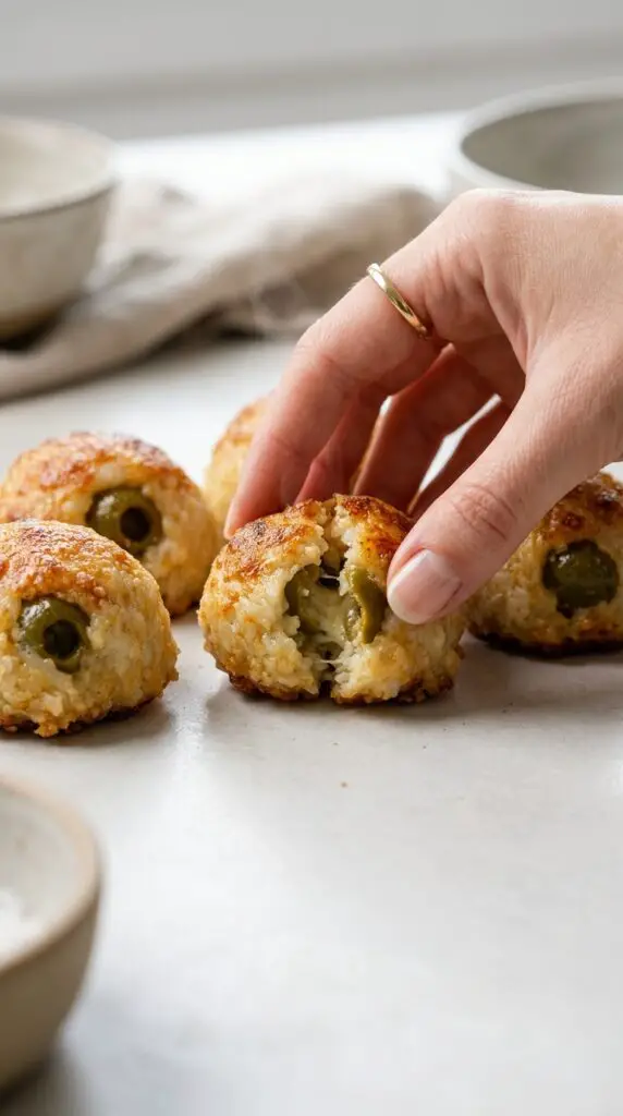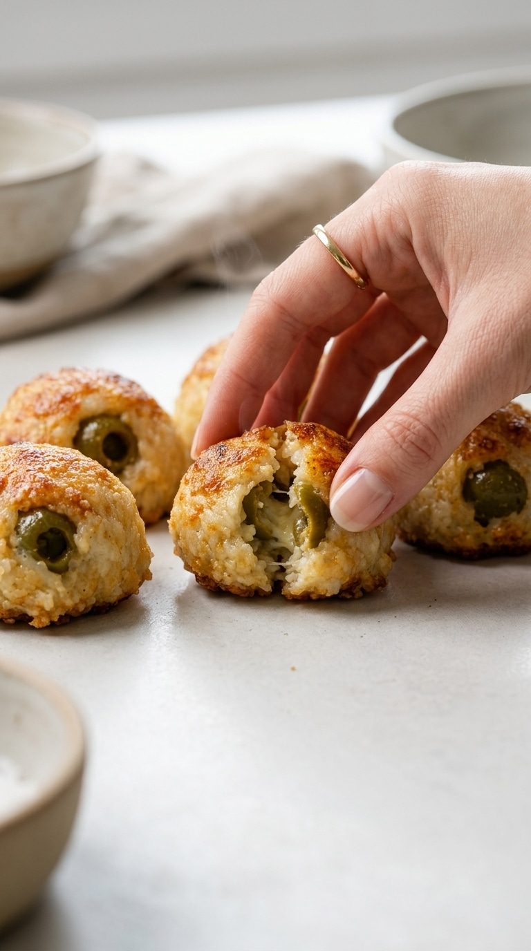 The magic of this recipe lies in its texture. As the cheese bakes, it melts and forms a golden, slightly crisp exterior. At the same time, it wraps tightly around the olive, locking in moisture and flavor.