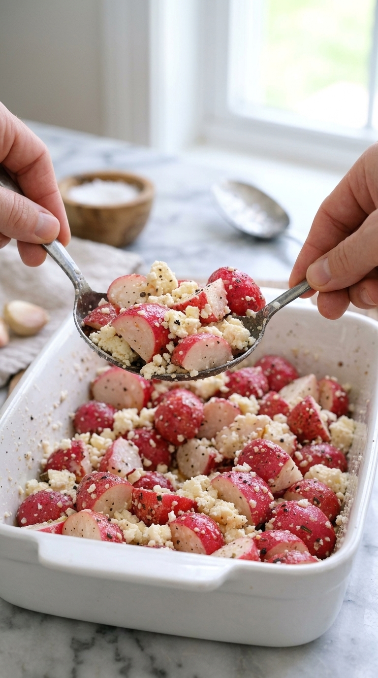 This dish works because it mimics the texture and comfort of a classic potato casserole without the carbs. When roasted, radishes lose their sharp bite and become tender with a slightly nutty flavor. As a result, they take on a role similar to potatoes but feel lighter on the palate.