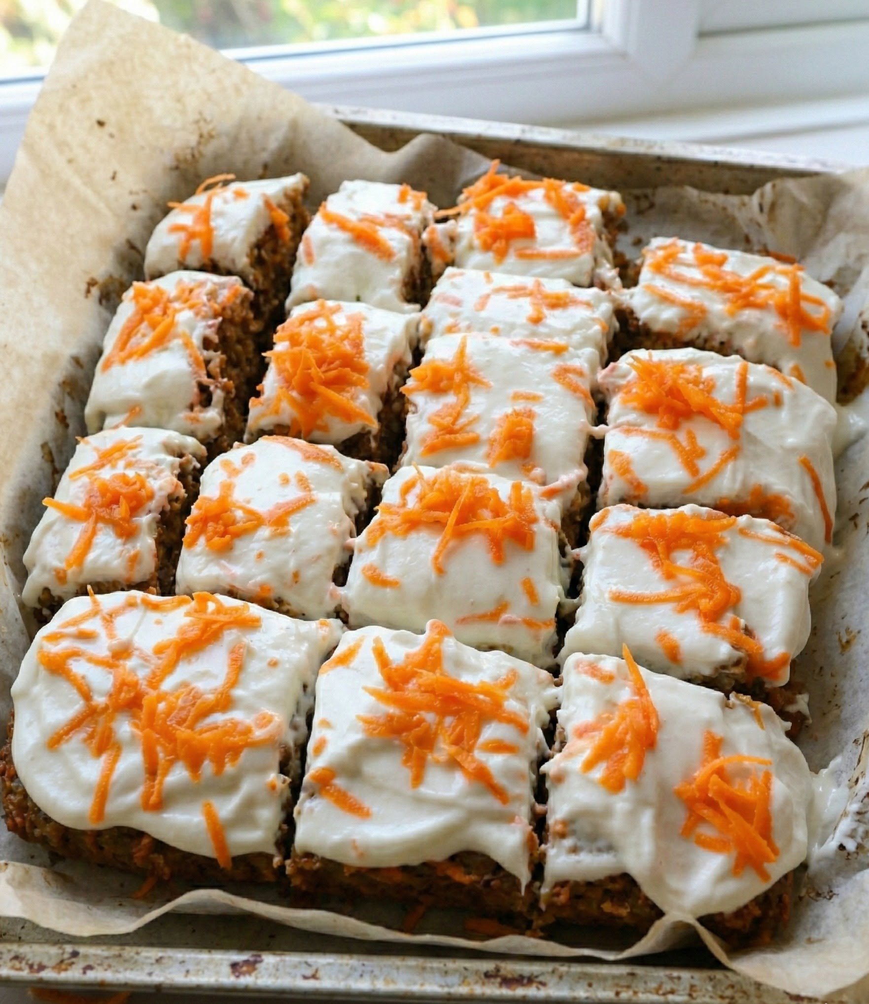 When the cake comes out of the oven, let it cool in the pan first. Then use the parchment paper to lift it out carefully. This cooling step is important because the topping needs a cool surface. If the cake stays too warm, the frosting can melt and become runny.