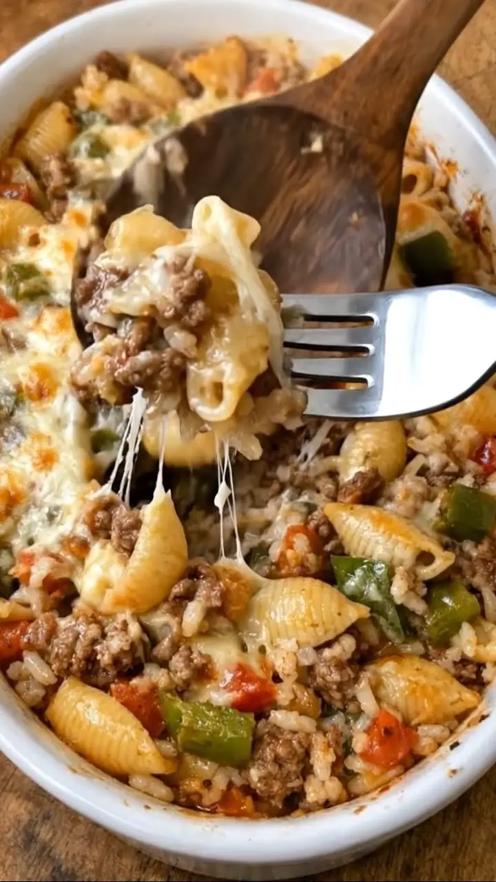 What makes this recipe so special is how everything cooks together in one dish. The pasta and rice absorb the rich tomato sauce while the beef and peppers add texture and flavor. As it bakes, the top becomes golden and bubbly, creating a cozy, irresistible dinner that’s hard to beat.