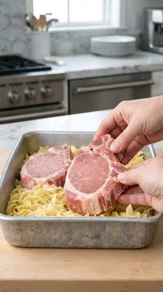 Then, place the pork chops directly on top of the noodles. Keep them spaced out so each piece cooks evenly.