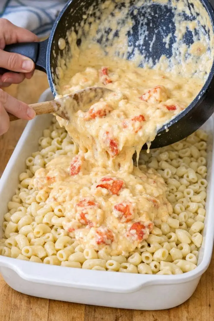Pour the lobster cheese mixture over the macaroni, making sure everything is evenly coated.