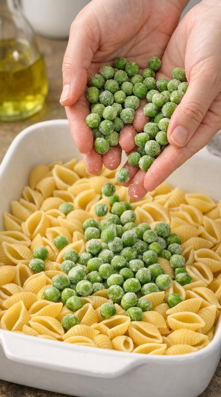 Start by spreading the dry pasta shells evenly in a greased baking dish. Then scatter the frozen peas on top. This layering helps the peas steam gently while the pasta absorbs the liquid below.