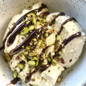 6. Serve & Top: Scoop the ice cream into bowls or cones. Drizzle with the melted chocolate and sprinkle with the remaining chopped pistachios. Serve immediately!