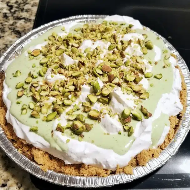 Before serving, sprinkle extra crushed pistachios on top. Slice it up and watch it disappear—this pie is a crowd-pleaser!