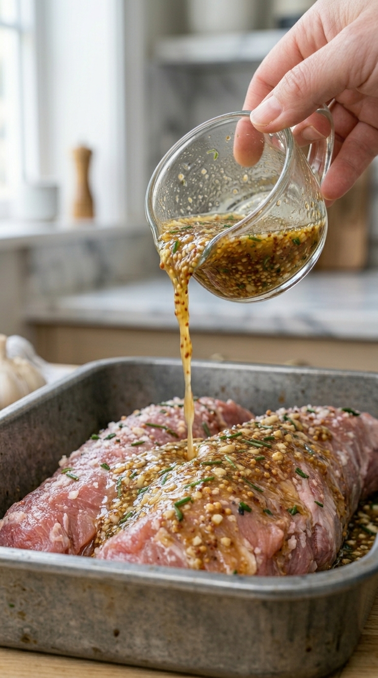 Pour the sauce directly over the raw pork in the roasting pan. Make sure the pork sits in the center so the sauce surrounds it evenly. Avoid stirring once the sauce is added. As it cooks, it will naturally coat and baste the meat, creating that signature glossy finish.