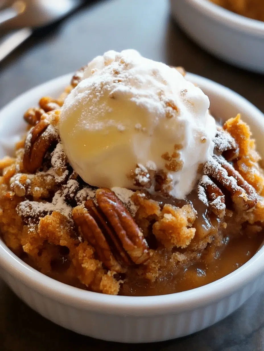 - Irresistible Texture: Creamy pumpkin base, a crunchy pecan topping, and a gooey caramel-like sauce underneath—this cobbler is a textural masterpiece!