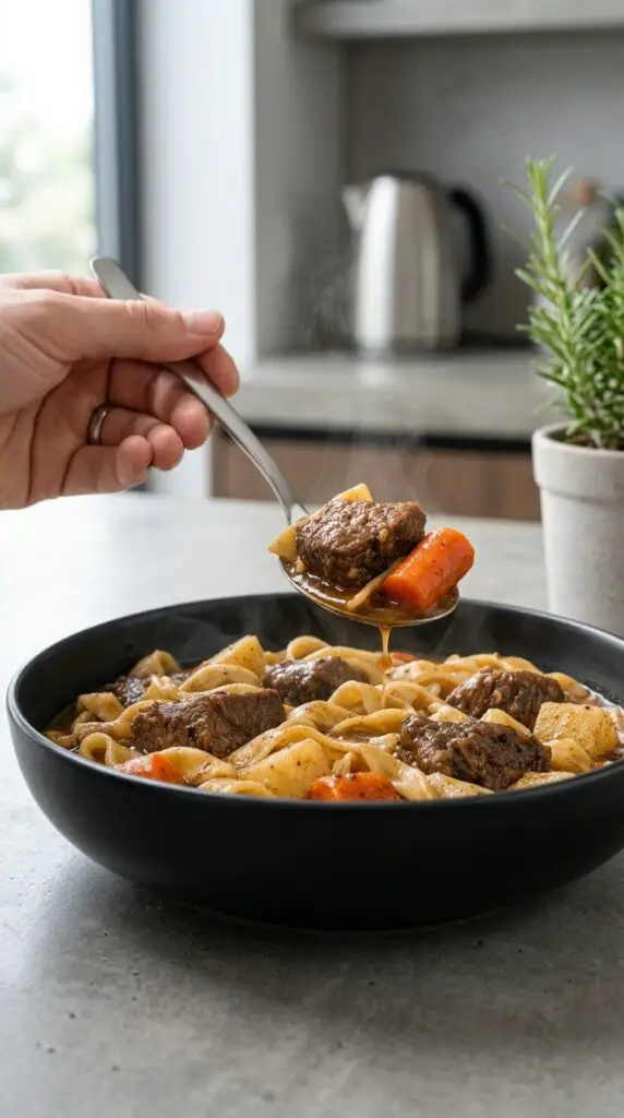 One of the biggest advantages of Slow Cooker 3-Ingredient Beef Stew Noodles is how much flavor develops from so few components. Each ingredient plays a key role. The beef provides richness, the condensed soup or seasoning mix creates a savory base, and the noodles absorb everything into a cohesive dish.
