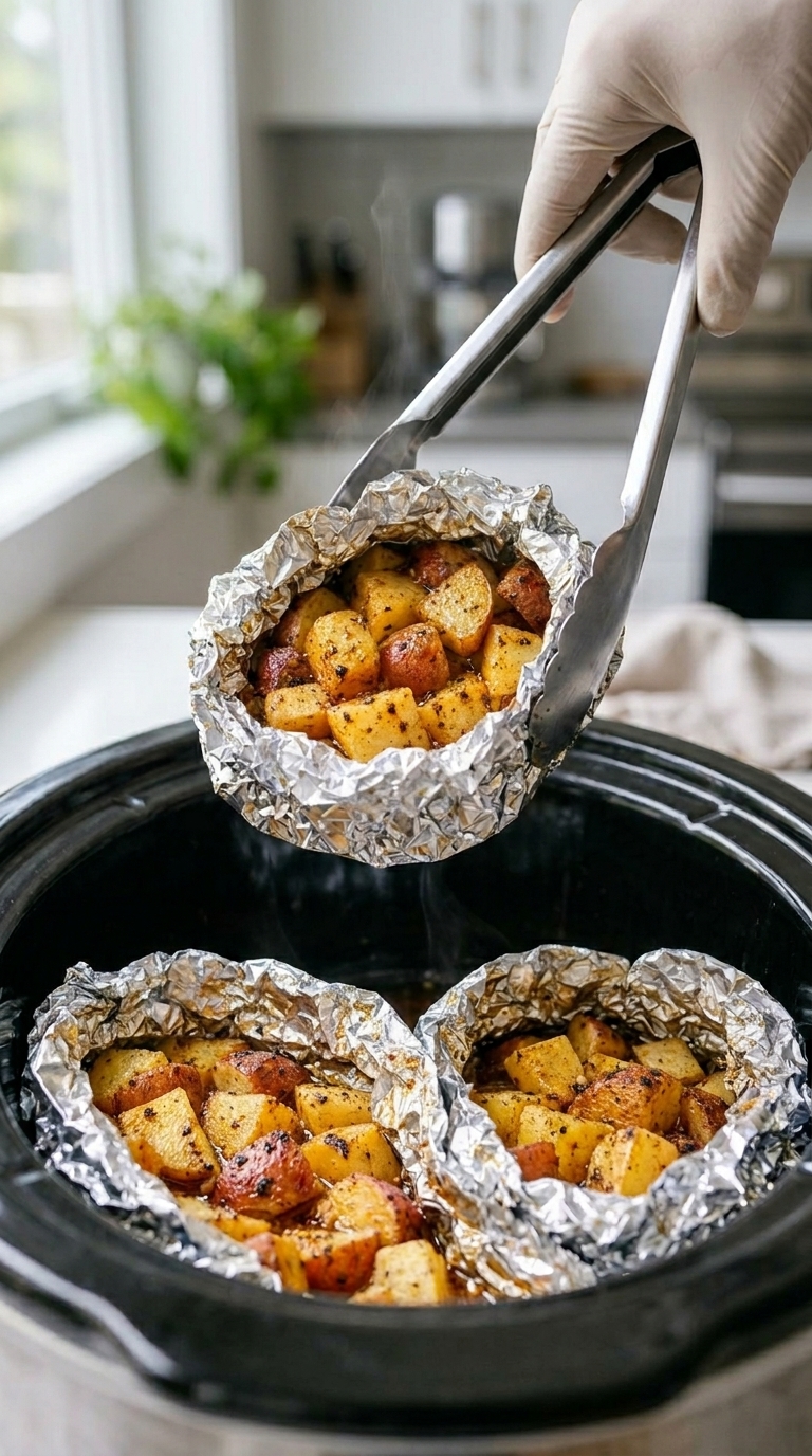 The Slow Cooker 3-Ingredient Cajun Butter Potato Packets recipe relies on foil packets to create a sealed cooking environment. This method traps steam, allowing the potatoes to cook evenly while staying moist.