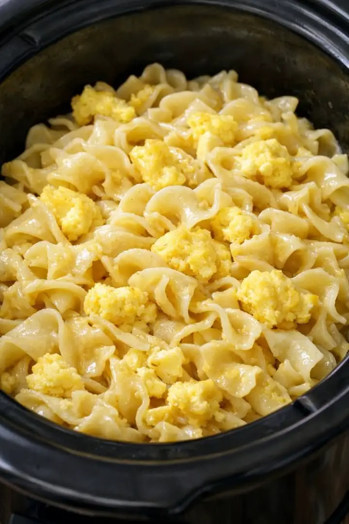 Cover the slow cooker and cook on LOW for 2 to 2 1/2 hours. About halfway through, gently stir the noodles to distribute the eggs evenly.