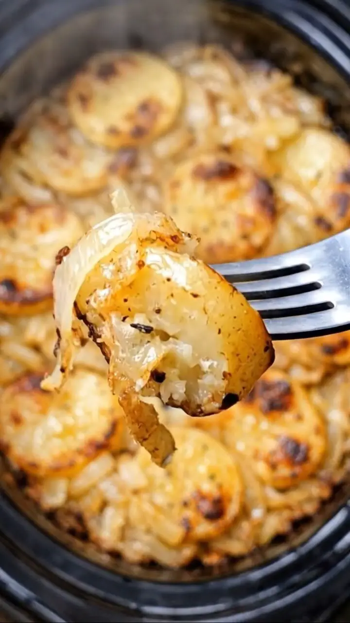 Once assembled, the slow cooker takes over completely. Over several hours, the ingredients break down and blend together. The potatoes become fork-tender, and the onions turn golden and soft.