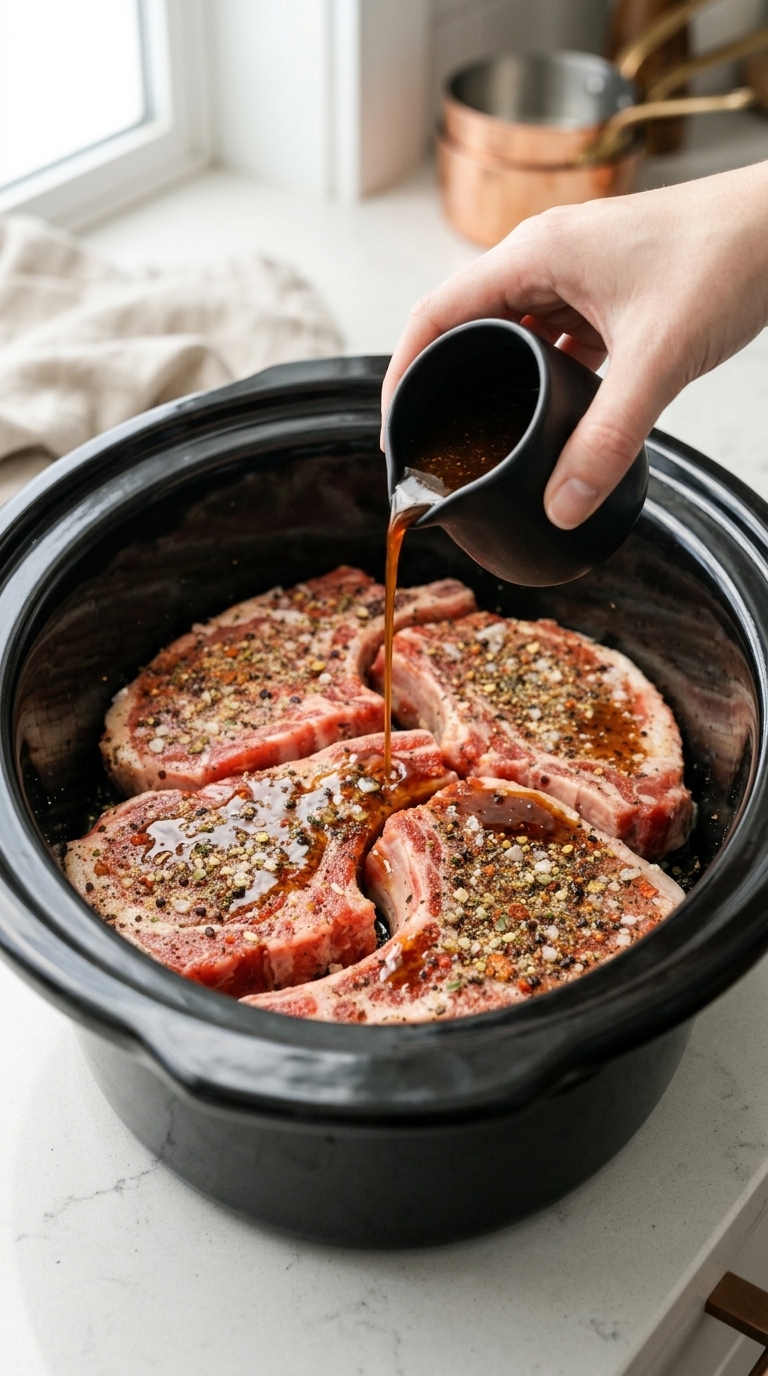 Pour the mixture over the pork chops, ensuring the liquid spreads evenly. This creates the base that will slowly transform into a rich, flavorful sauce.