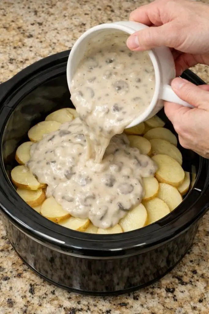 Start by greasing the slow cooker to prevent sticking. Then, layer half of the sliced potatoes on the bottom, followed by half of the diced ham.