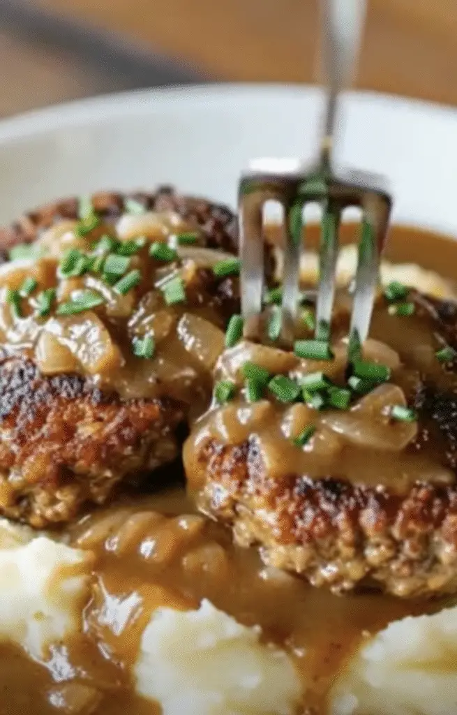 Onions sautéed until soft and combined with beef broth create a naturally savory, slightly sweet gravy. Thickening with a cornstarch slurry gives the sauce the perfect consistency to coat the patties and mashed potatoes. The result is a classic flavor pairing that feels indulgent but is effortless to prepare.
