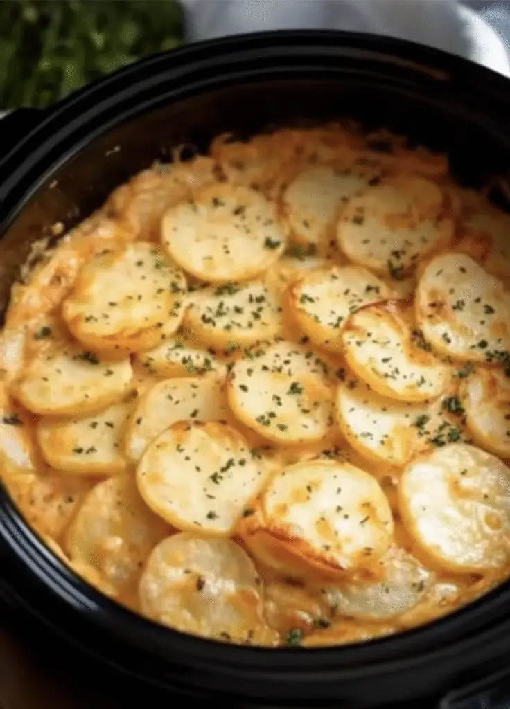 Scalloped potatoes typically involve layers of thinly sliced potatoes baked in a creamy sauce, often with cheese — and this version does all that, but in the slow cooker. No oven babysitting, no complicated roux — just effortless comfort food.