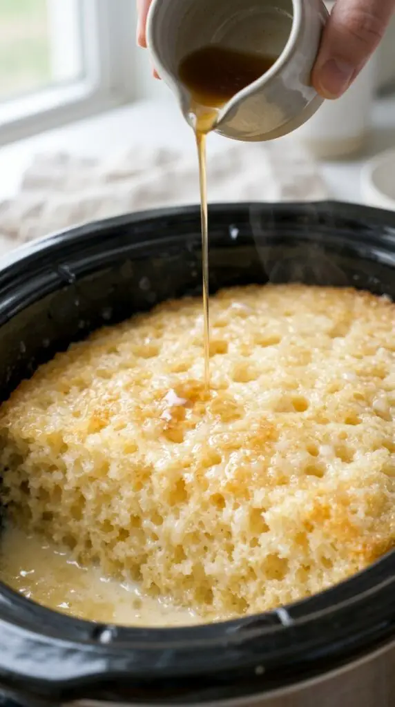 The soaking stage is where Slow Cooker “Three Milks” Sponge Cake becomes truly special. While the cake is still warm, holes are poked across the surface to allow deep absorption.