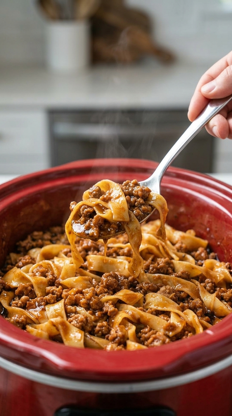 Because the slow cooker gently simmers everything over several hours, the ingredients have time to fully develop their flavors. The beef becomes tender, while the sauce thickens into a rich, savory base that coats every bite.