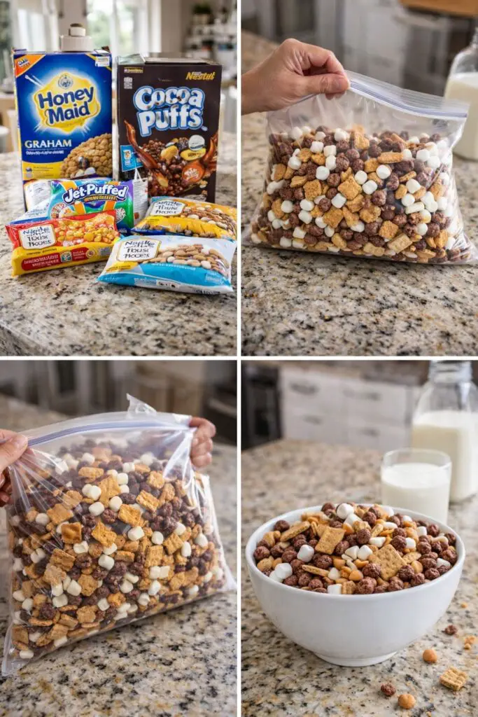 Smores Snack Mix Cereal uses simple ingredients that deliver a perfect balance of textures. Chocolate cereal forms the crunchy base, while mini marshmallows add softness and sweetness. Graham cracker pieces bring that signature s’mores flavor, and chocolate chips provide rich bursts of chocolate in every bite.